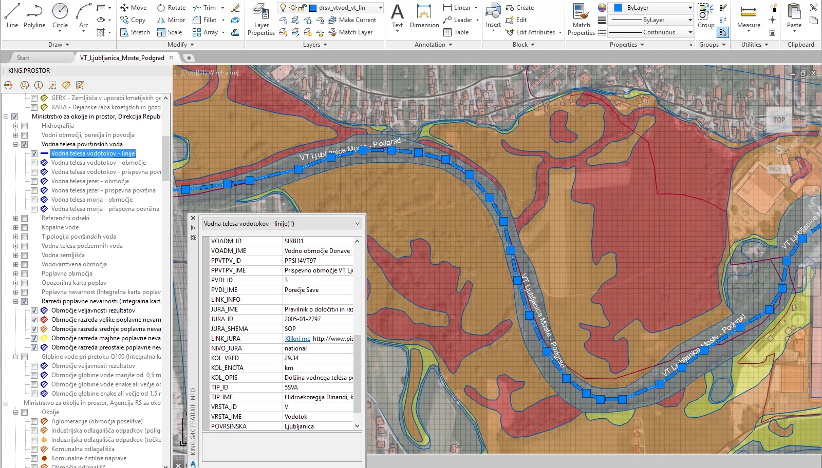 River body Ljubljanica Moste - Podgrad with river flooding stages from Water cadastre, Slovenian Water Agency. City Medvode, building cadastre, land cadastre, real estate register, public infrastructure, cultural heritage, running waters and flooding. Technical database with spatial and network topology